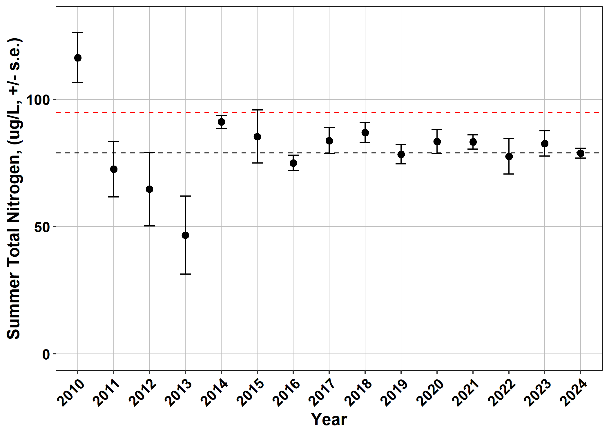 Nitrogen is a nutrient used in algal production and high levels of nitrogen can often result in algal blooms. Increases in nutrients such as nitrogen are often due to human influence. Whitefish lake has a total nitrogen long-term average of 79 ug/L.  The Water Quality Standard  WLI has set for total nitrogen is 95 ug/L, anything above this level for three consecutive years does not meet the water quality criteria.