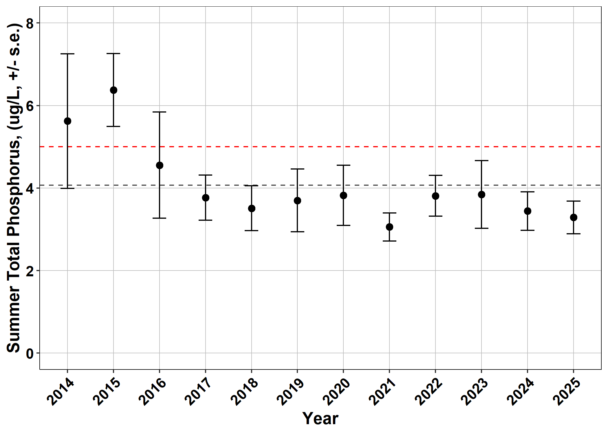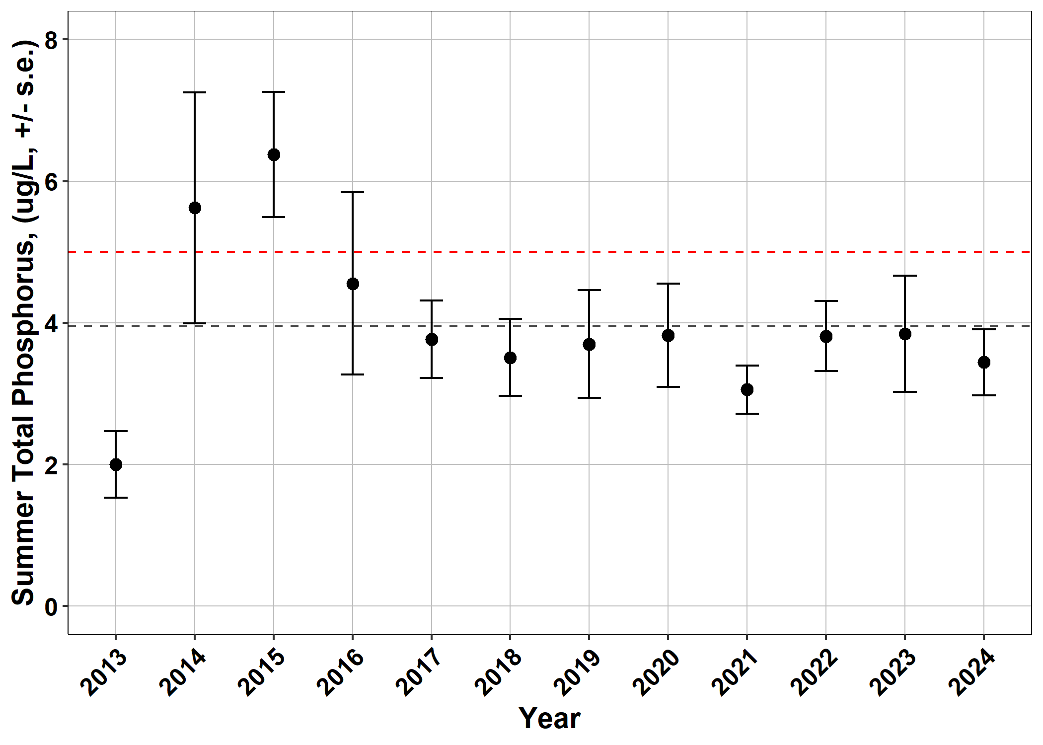 Phosphorus is a nutrient used in algal production and can often come from human driven sources such as septic leachate, fertilizer, detergents, or soil erosion. The long-term average for phosphorus in Whitefish Lake is 4 ug/L. The Water Quality Standard set for total phosphorus is 5 ug/L. Any annual mean data above this level for three consecutive years does not meet this standard.