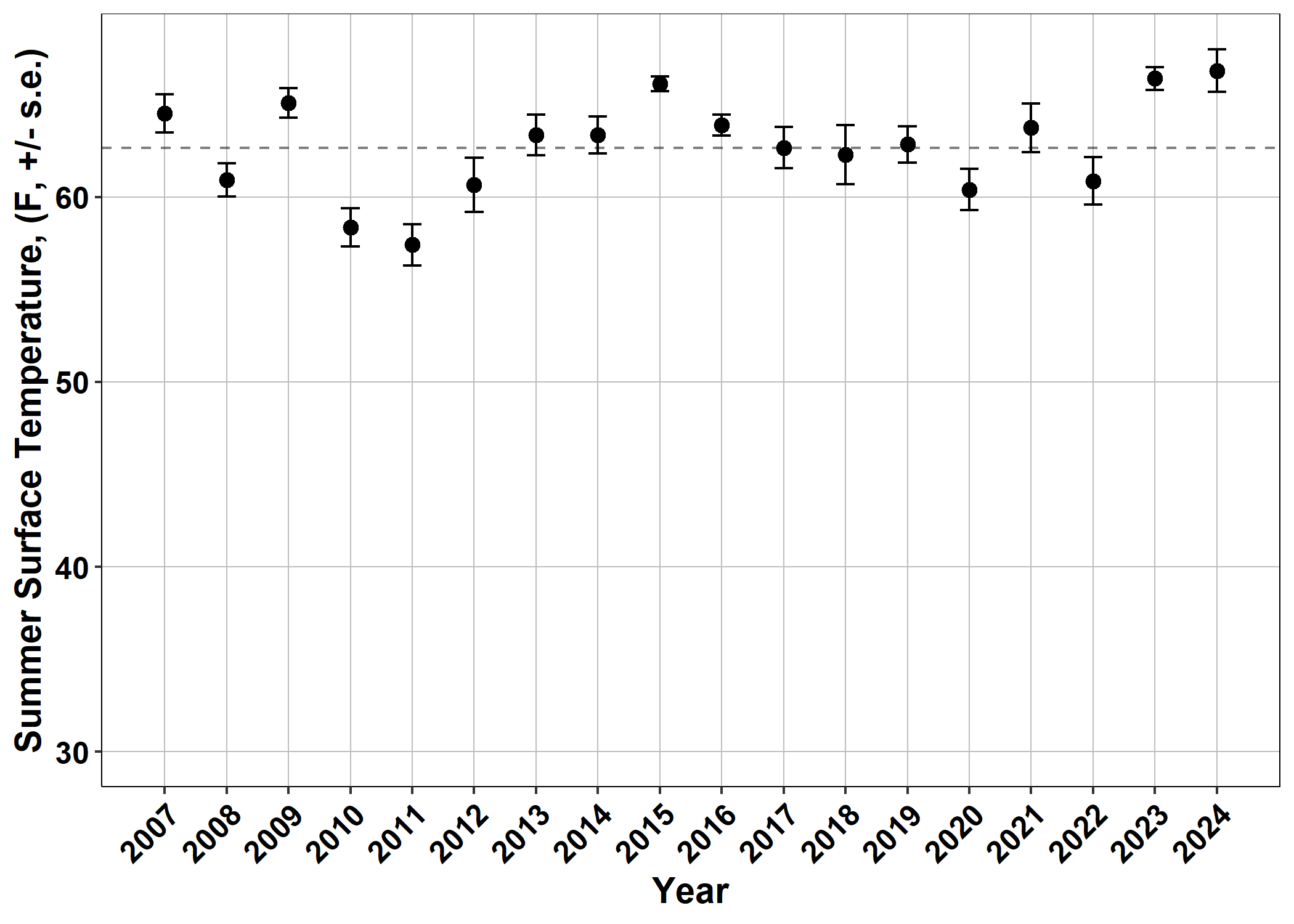 The long-term average surface temperature is 63 degrees. Higher lake surface temperatures can lead to more algal production.