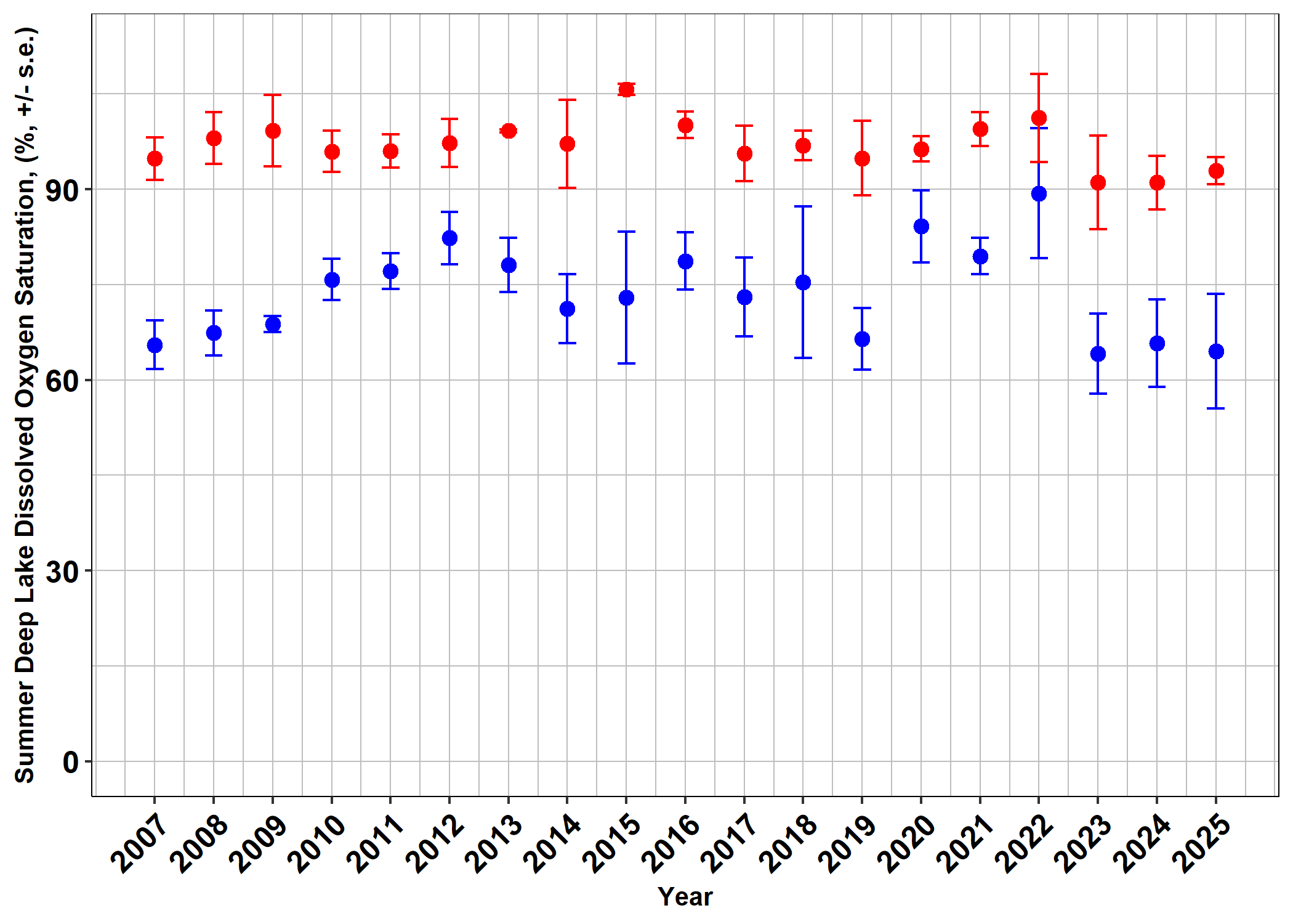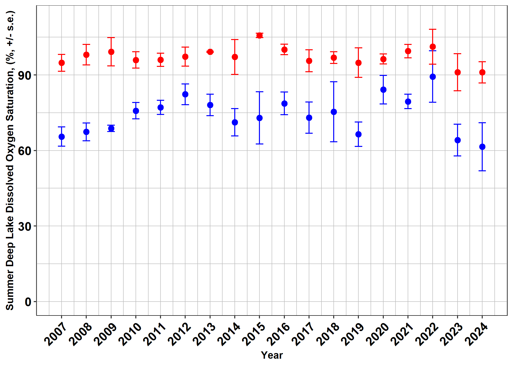 Dissolved oxygen at the bottom of the lake is important for fish habitat. In many lakes due to longer and warmer summers in deep waters, dissolved oxygen is decreasing. In Whitefish Lake dissolved oxygen levels are remaining high. For both sites combined, the summer average of dissolved oxygen saturation is 85%. In the graph below the deep sampling site is indicated in blue, and the shallow sampling site is indicated in red.
