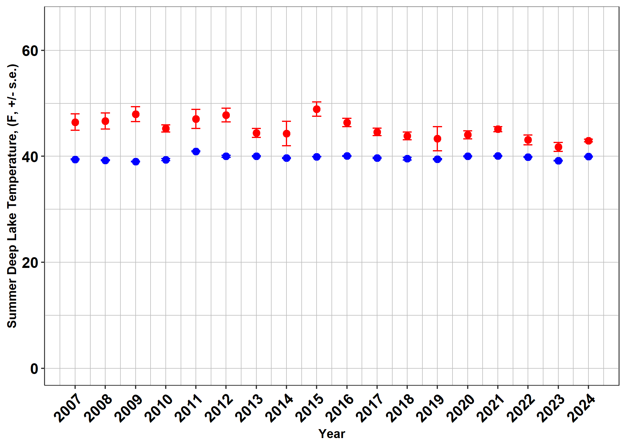 This graph shows the water temperature at the bottom of the lake. This is the coldest area of the lake and important fish habitat. It is important to monitor this area as rising temperatures may endanger this critical habitat. In the graph below the deep sampling site is indicated in blue, and the shallow sampling site is indicated in red.
